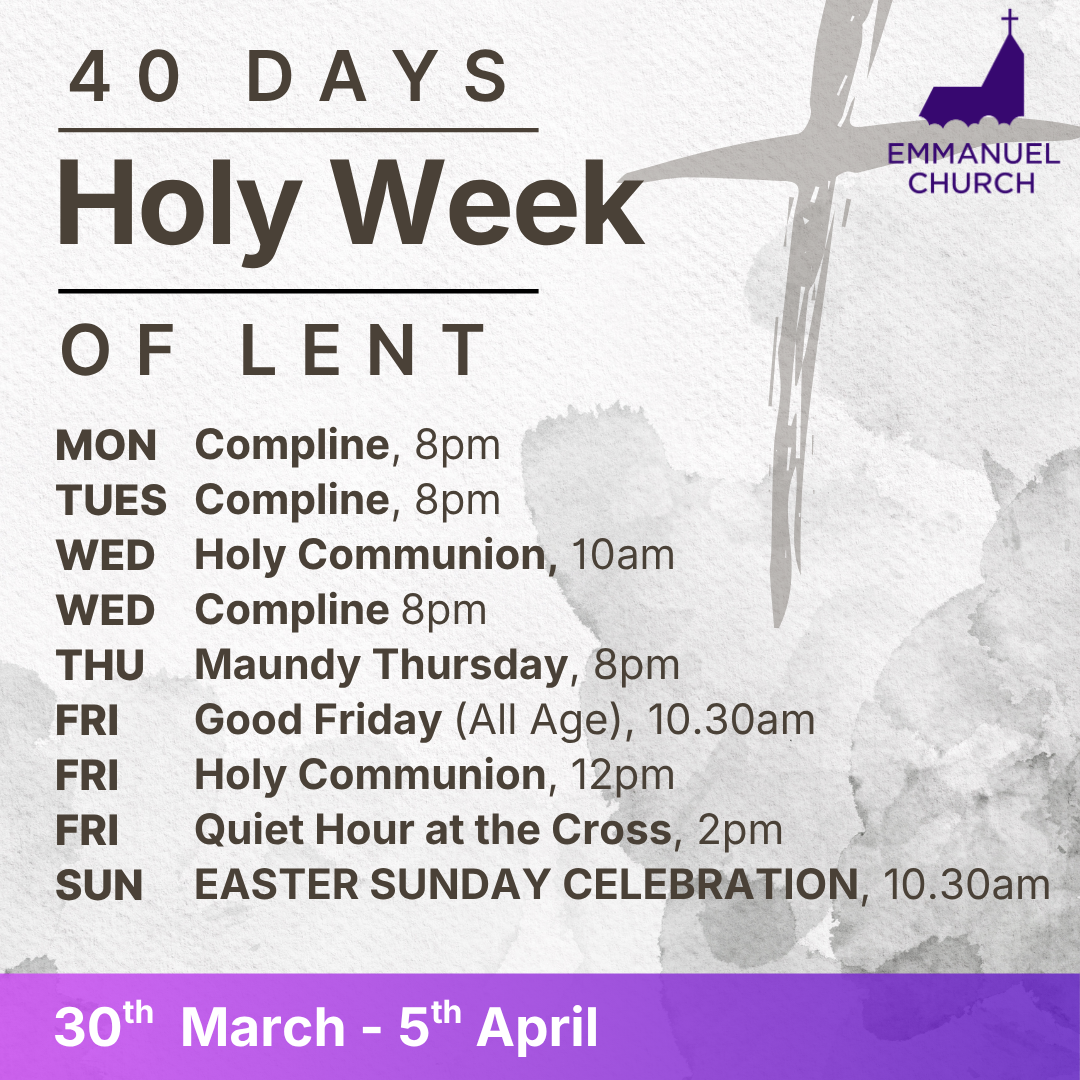 During Holy Week As Holy Week we have plenty of opportunities to pause, reflect and remember Jesus’ incredible love for us shown on the cross. We’d love to see you at any of our services.